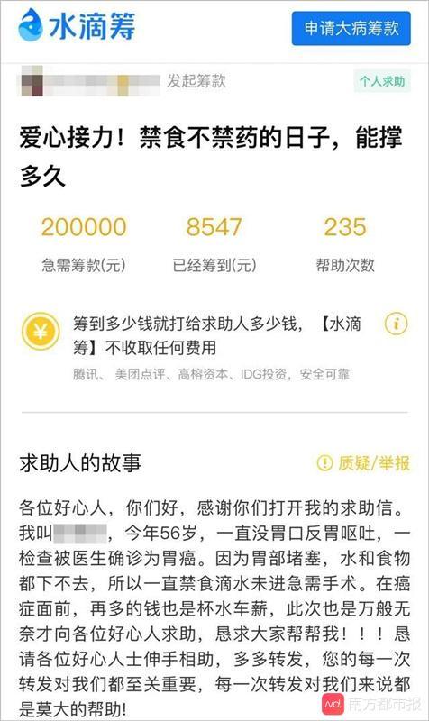 5月10日,杭州蕭山一女子通過水滴籌發(fā)起20萬元籌款,稱父親確診胃癌需要救治。很多網(wǎng)友通過轉(zhuǎn)發(fā)捐款伸出援助之手。但隨后就有網(wǎng)友發(fā)現(xiàn),該女子曬出的檢查報告單,患者并未確診胃癌,而她則在父親剛檢查完的第二天就發(fā)起了籌款。6月3日,籌款女子以“急等錢續(xù)繳醫(yī)院費用”為由,提取了8547元的善款。