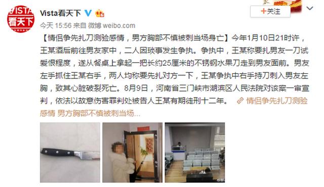 一對男女戀人因瑣事發(fā)生爭執(zhí),女子為試愛恨程度持水果刀刺中男友胸部致其心臟破裂死亡。8月9日,河南省三門峽市湖濱區(qū)人民法院對該案一審宣判,依法以故意傷害罪判處被告人王某有期徒刑十二年。