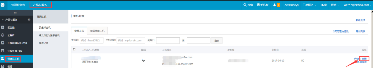1、登錄云虛擬主機的管理控制臺,在產(chǎn)品管理中找到云虛擬主機,然后就可以執(zhí)行進一步管理。如下圖: