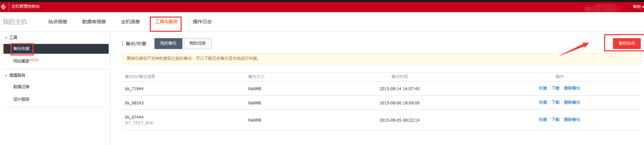2、在主機管理控制臺——>工具和服務(wù)——>備份恢復(fù)——>備份站點——>備份數(shù)據(jù)庫