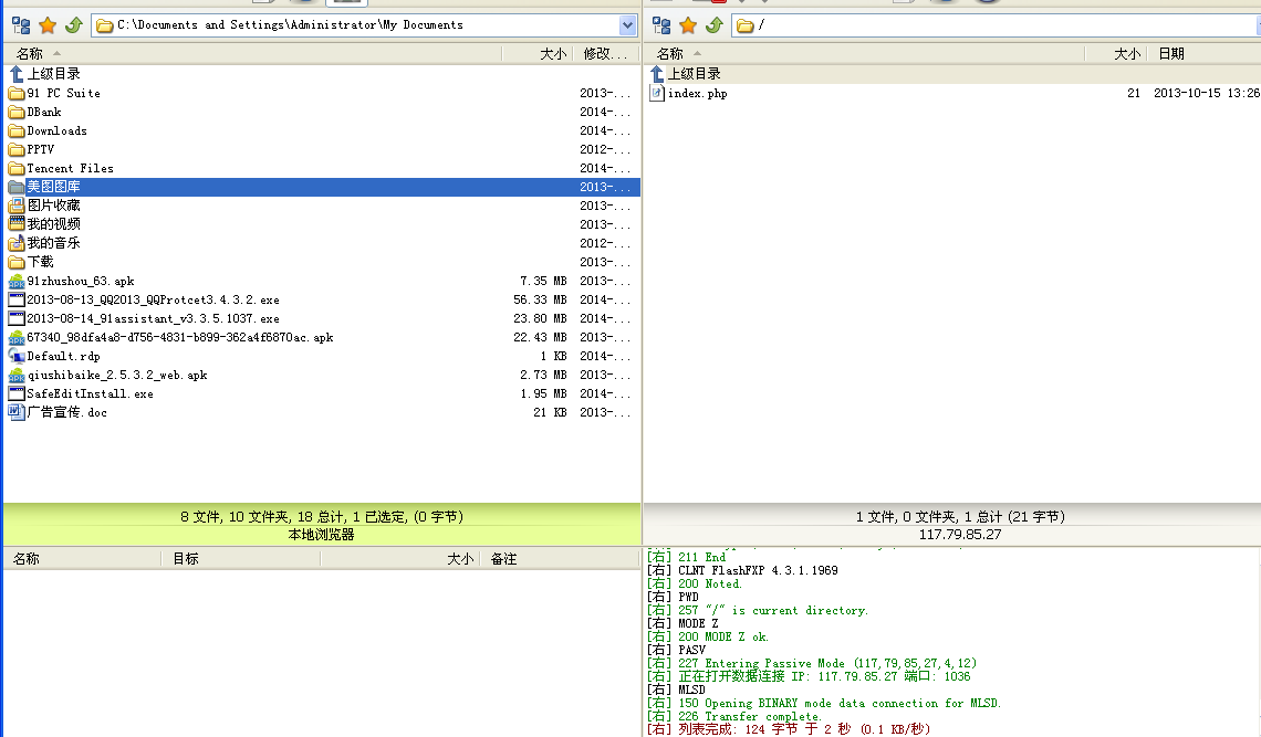 到此我們的ftp安裝測(cè)試完畢。左邊是我們的電腦,右邊是服務(wù)器,可以相互拖動(dòng),也可以右鍵點(diǎn)擊我們要下載或者上傳的文件點(diǎn)傳輸。