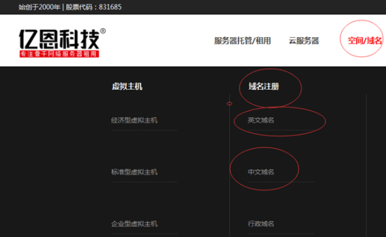 二、通過億恩科技首頁,找到空間/域名導(dǎo)航欄目,鼠標(biāo)放上后下面會顯示域名注冊、英文域名、中文域名等信息,點(diǎn)開域名注冊按紐進(jìn)入注冊域名詳情頁。