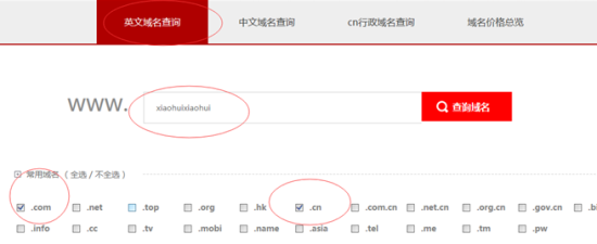 注意查詢的時(shí)候不用輸WWW,空格里邊輸入所要注冊的域名,比如說你要注冊的域名是www.xiaohuixiaohui.com或www.xiaohuixiaohui.cn如上圖所示,空格處輸入xiaohuixiaohui在下面選擇COM或CN的后綴,(比較常用的是.com和.cn)然后點(diǎn)擊查詢域名即可。