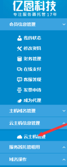 二、在億恩用戶管理系統(tǒng)中找到并點(diǎn)擊云主機(jī)管理