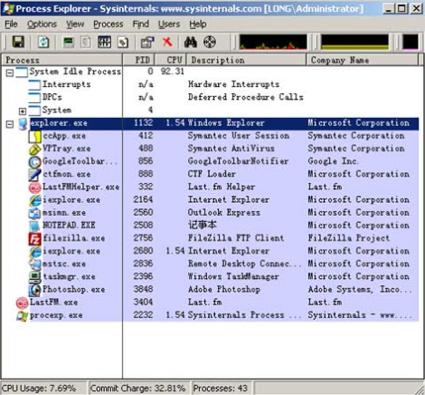 Process Explorer - Process Explorer是一款免費的進程監(jiān)視工具,功能比Windows自帶的任務管理器要強大的多,不僅可以監(jiān)視、暫停、終止進程,還可以查看進程調(diào)用的DLL文件,是預防病毒、查殺木馬的好幫手。